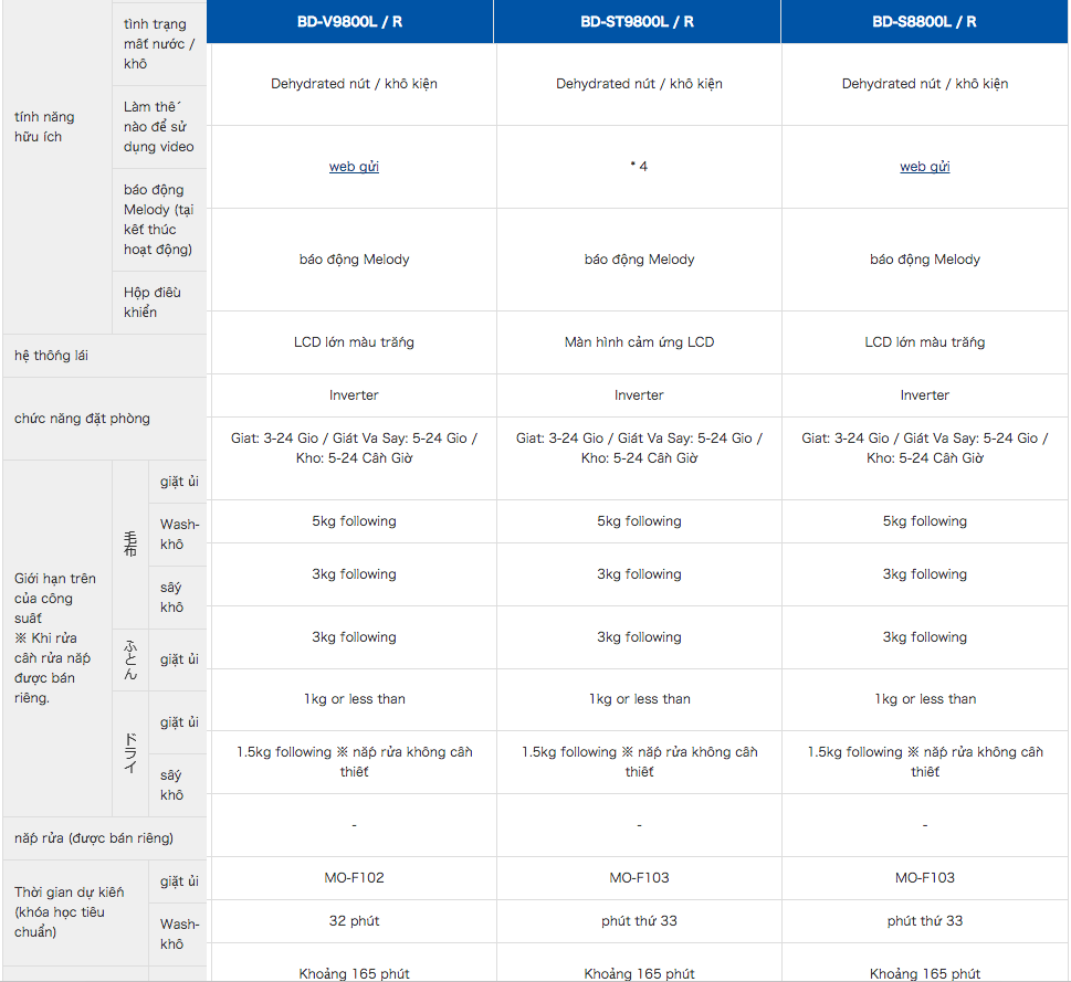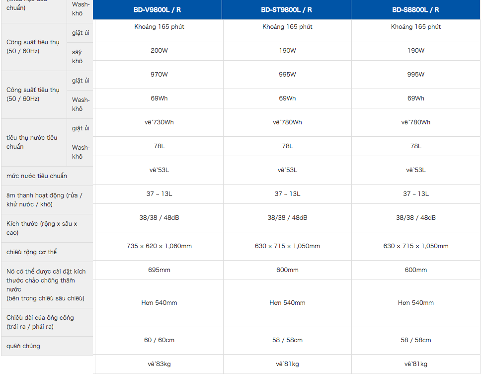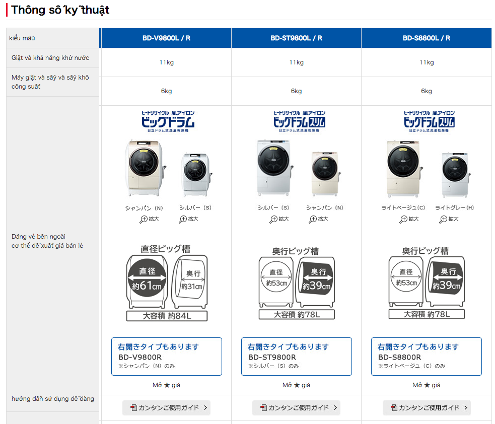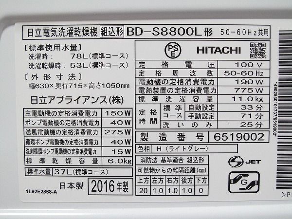 Thông số kỹ thuật của MÁY GIẶT SẤY HITACHI BD-S8800L