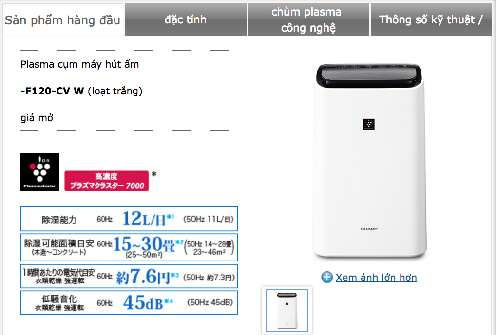 Thông số kỹ thuật của MÁY HÚT ẨM KIÊM LỌC KHÔNG KHÍ SHARP CV-F120-W