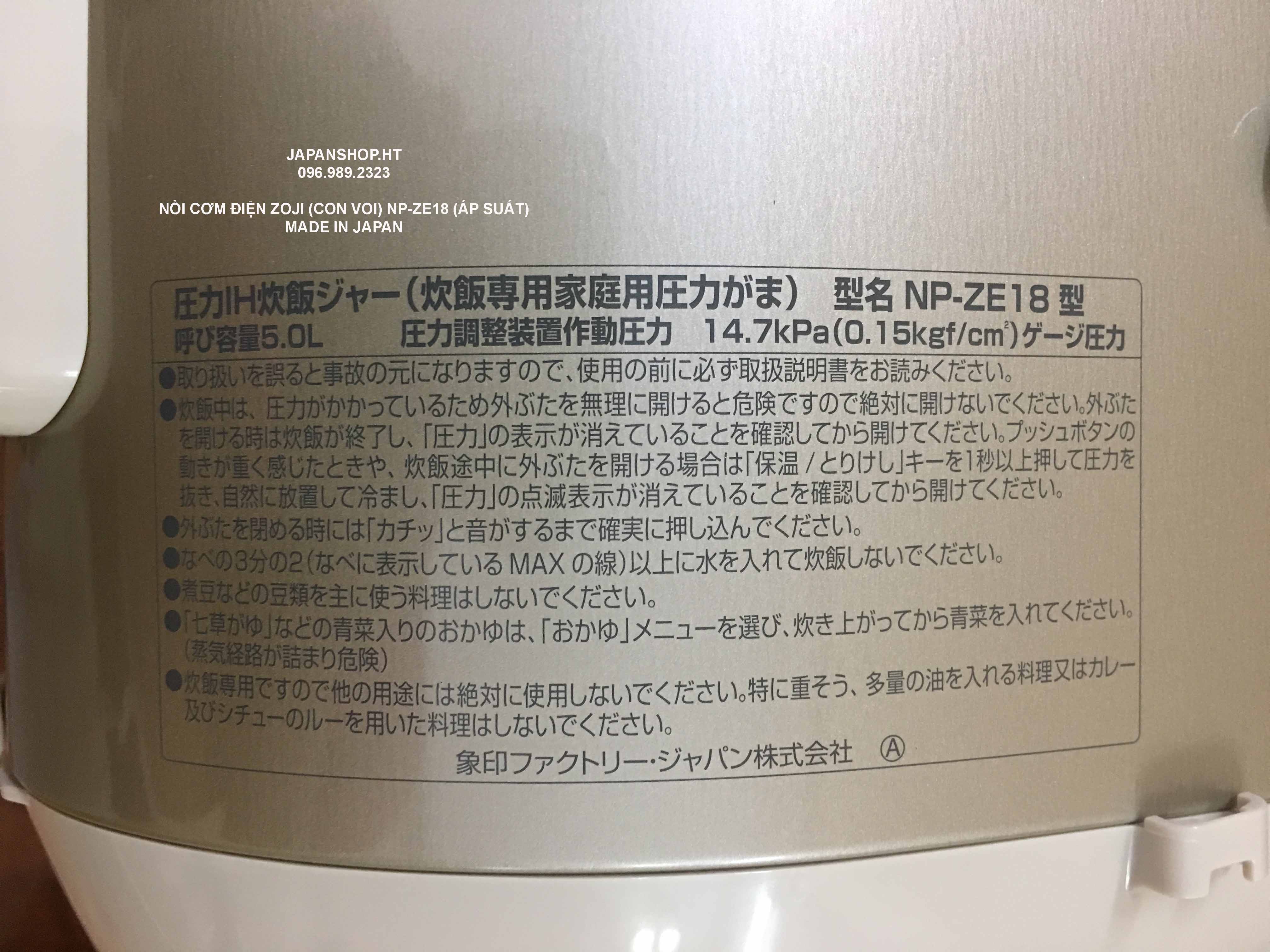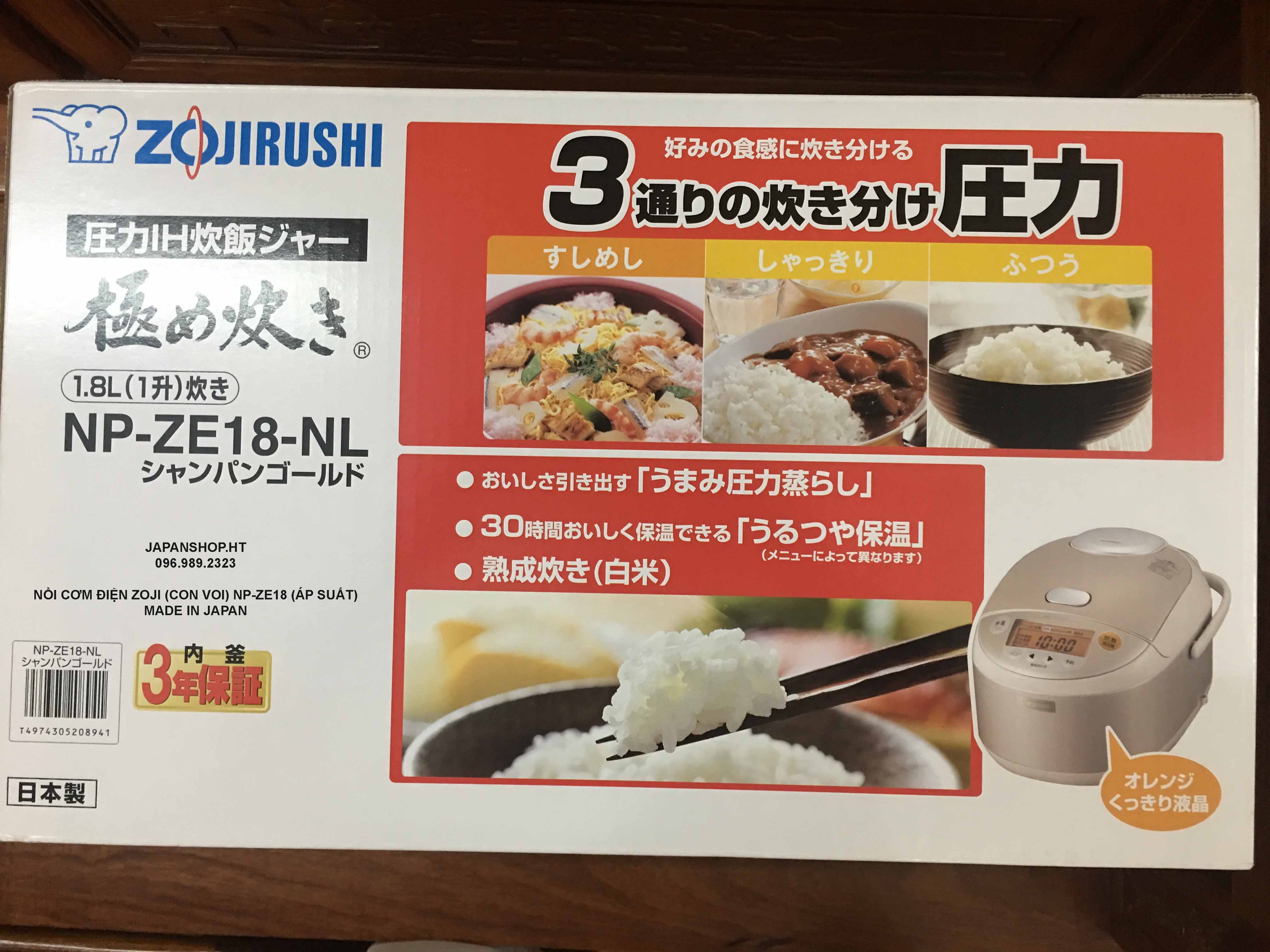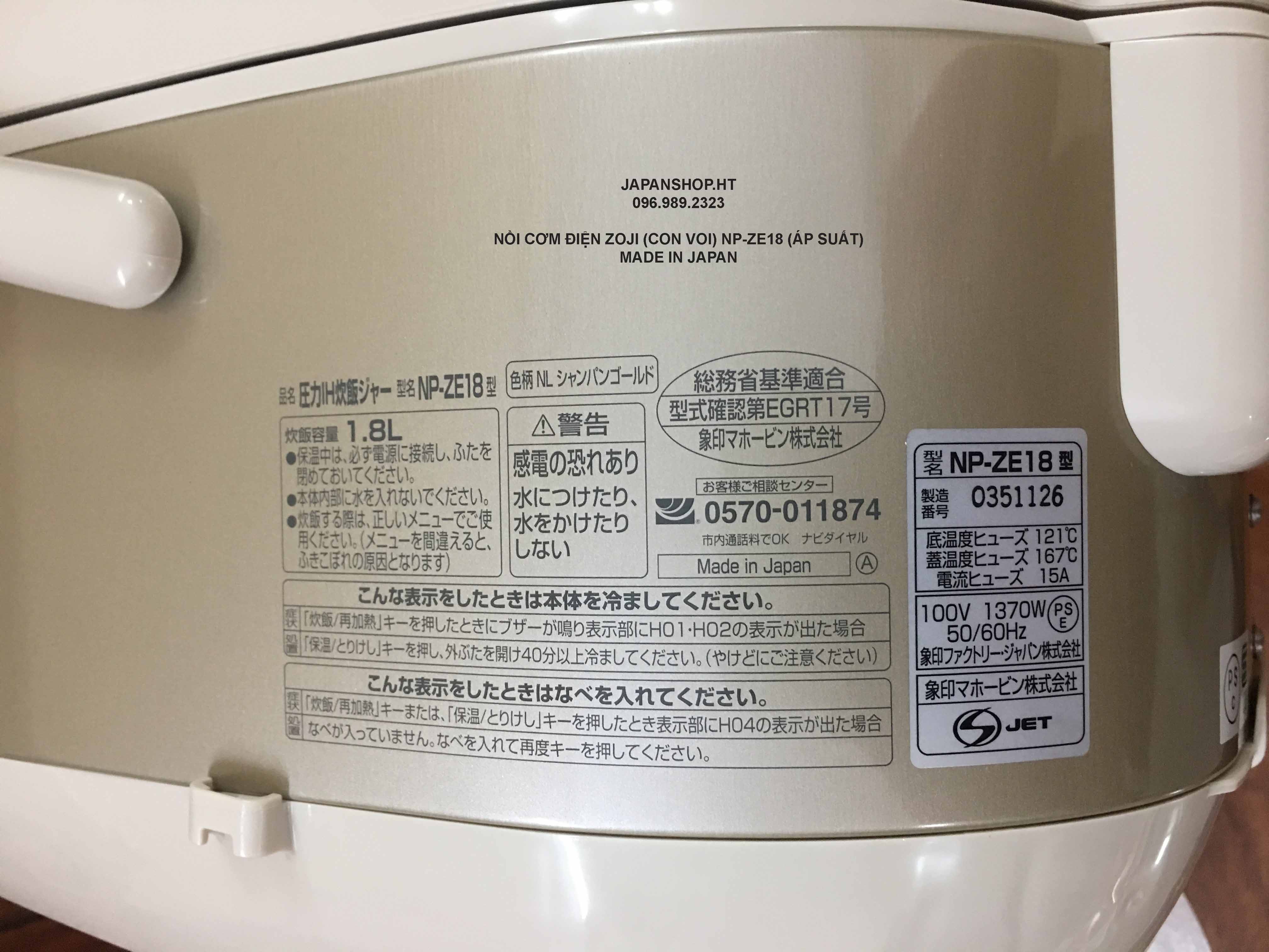 Thông số kỹ thuật của NỒI CƠM CAO TẦN ZOJIRUSHI (CON VOI) NP-ZE18-NL