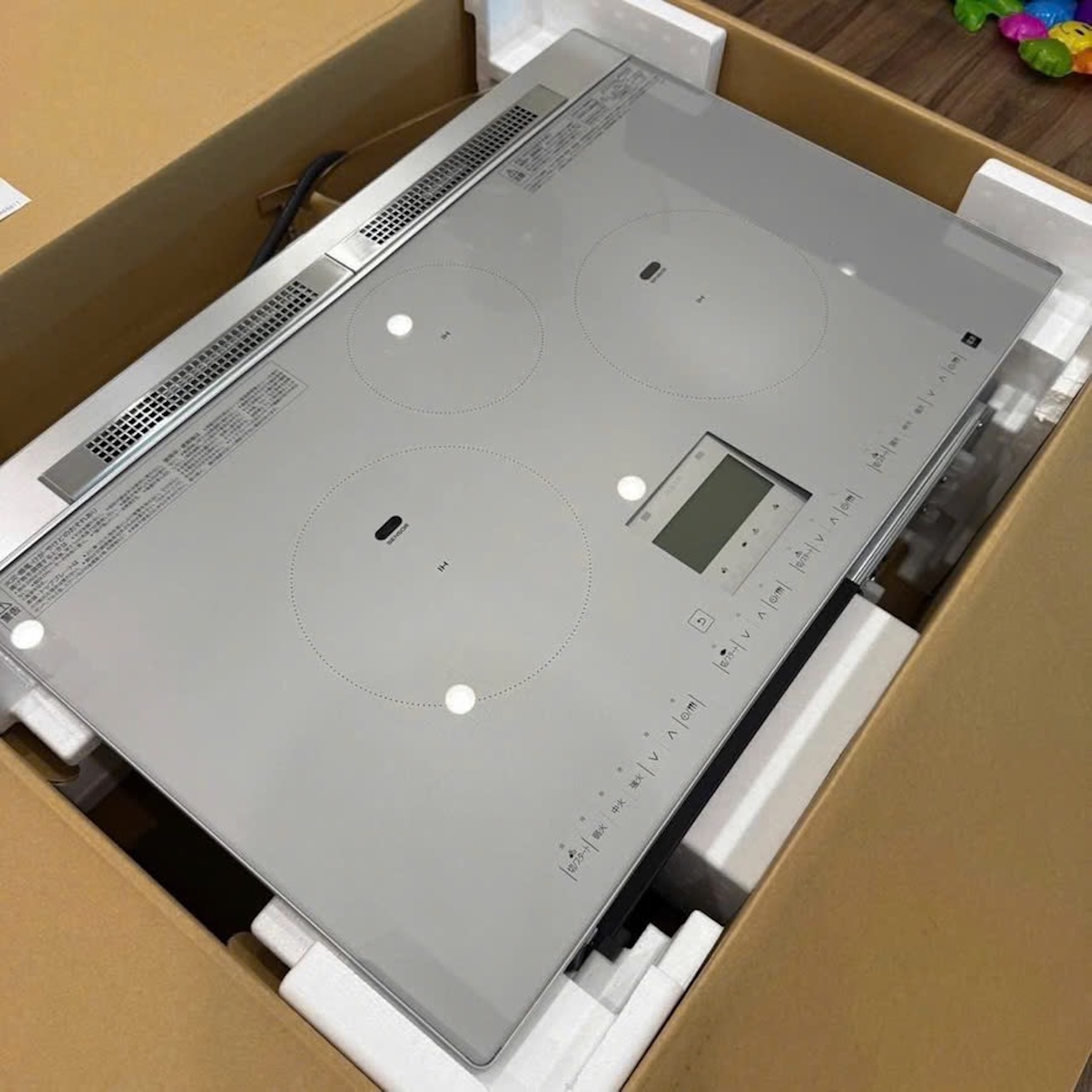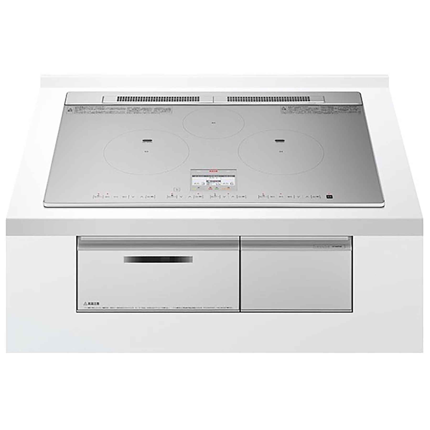 Mặt kính top plate màu bạc (Silver) cao cấp với viền mỏng siêu mỏng (thin frame), tạo cảm giác liền mạch với mặt bàn đá, không chiếm diện tích. Toàn bộ bảng điều khiển nằm trên mặt kính cảm ứng glass touch, màn hình LED 4 màu hiển thị rõ ràng công suất từng vùng, dễ quan sát ngay cả khi đang nấu. Thiết kế đối xứng trái-phải (左右フリー) cho phép lắp đặt linh hoạt, phù hợp mọi kiểu bếp.
