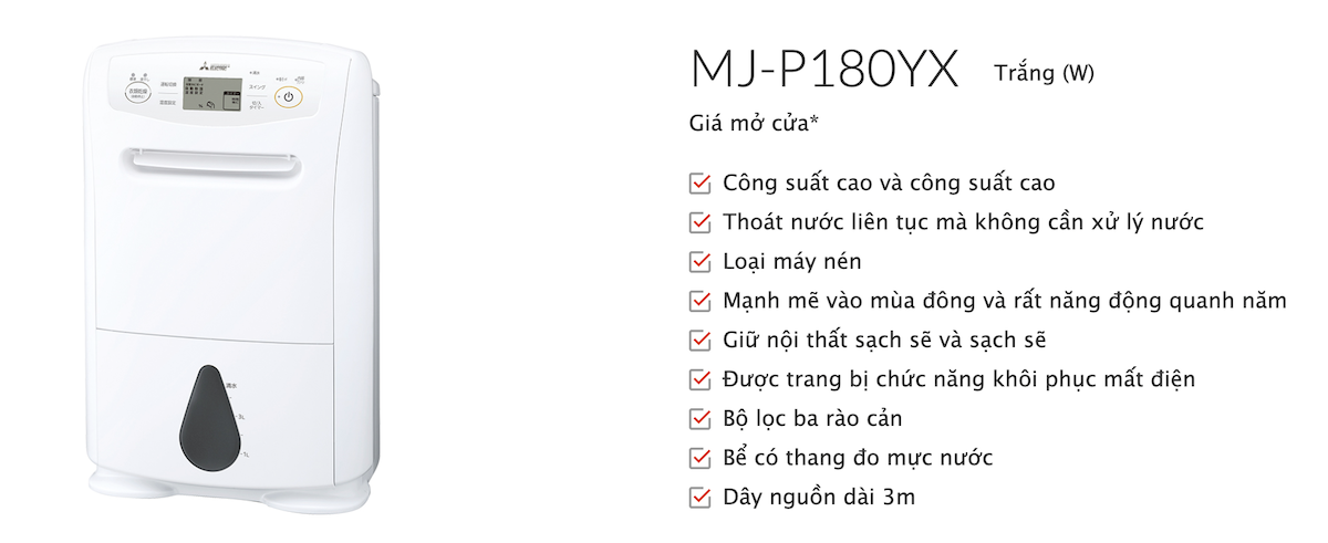 Thông số kỹ thuật của MÁY HÚT ẨM NHẬT NỘI ĐỊA MITSUBISHI MJ-P180YX-W (2025-2026) - MADE IN JAPAN