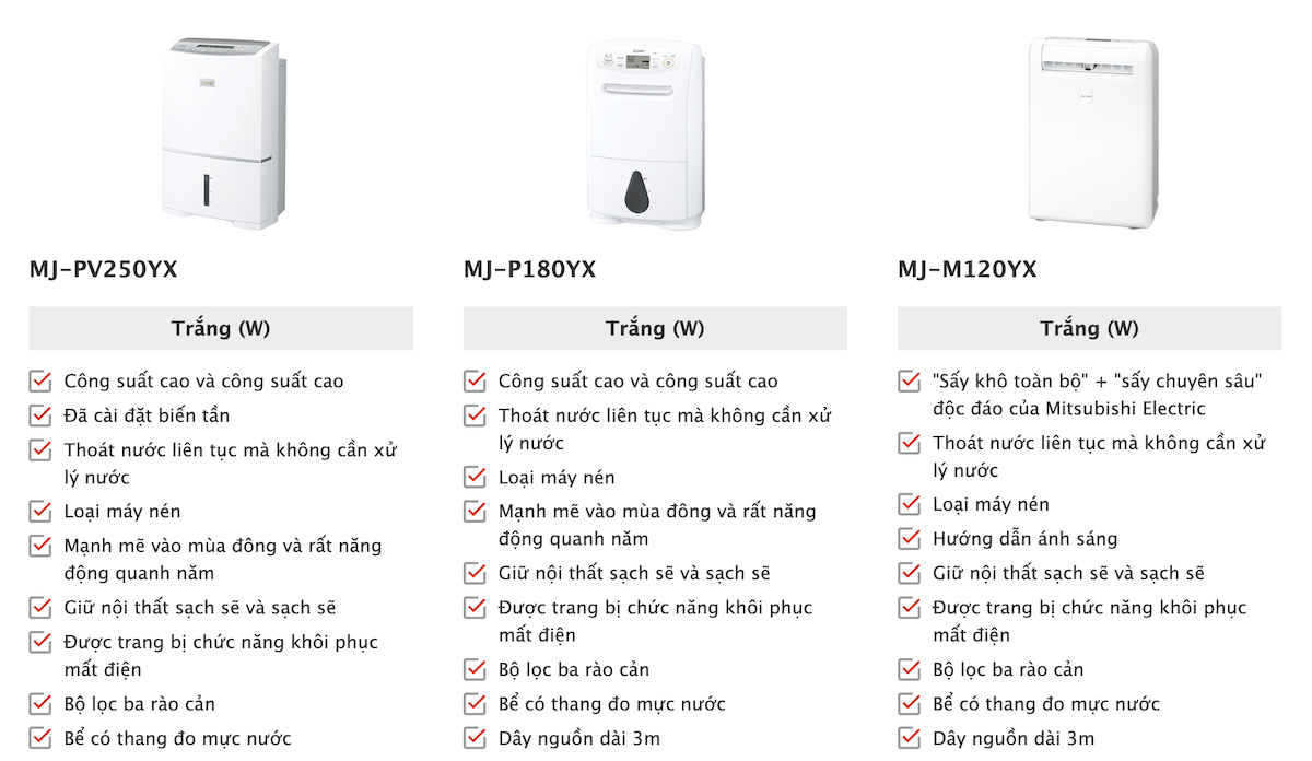 BẢNG SO SÁNH TÍNH NĂNG CÁC MÁY HÚT ẨM MITSUBISHI: