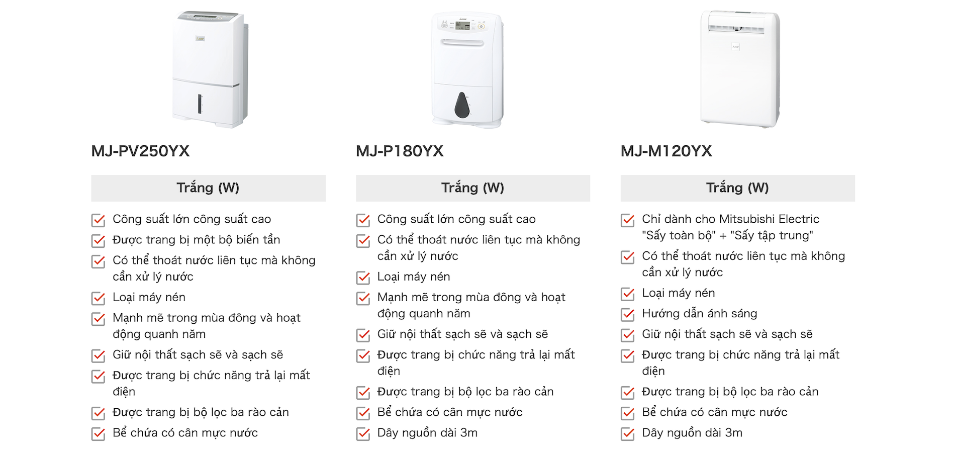 BẢNG SO SÁNH TÍNH NĂNG CÁC MÁY HÚT ẨM MITSUBISHI: