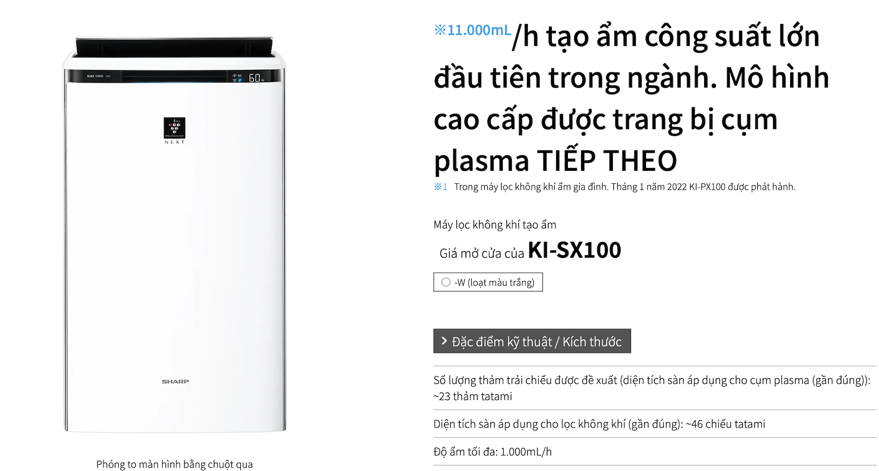 Thông số kỹ thuật của MÁY LỌC KHÔNG KHÍ BÙ ẨM SIÊU CAO CẤP SHARP KI-SX100-W NỘI ĐỊA NHẬT