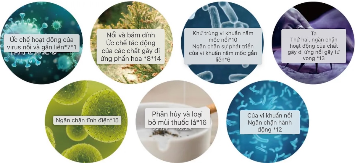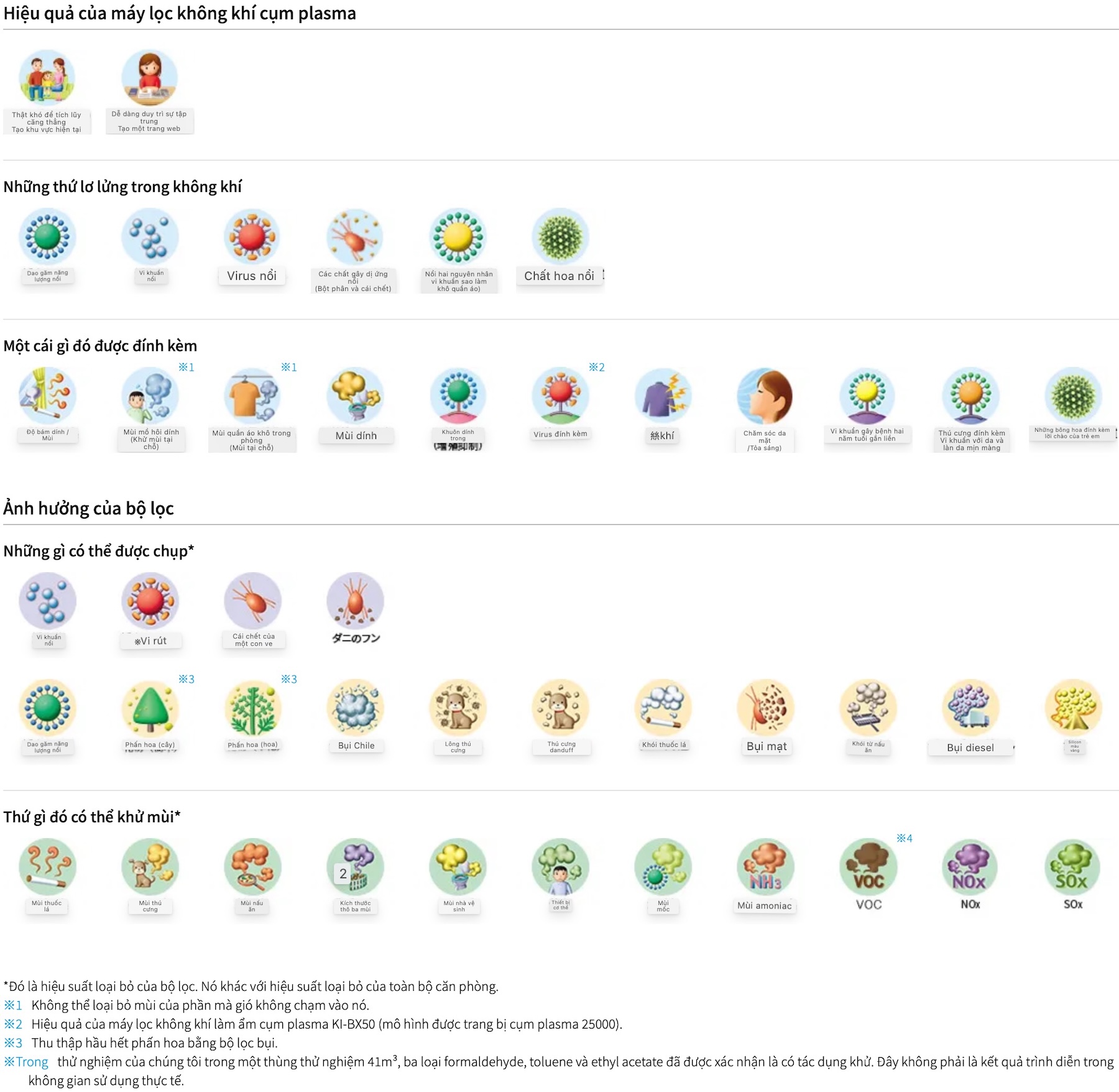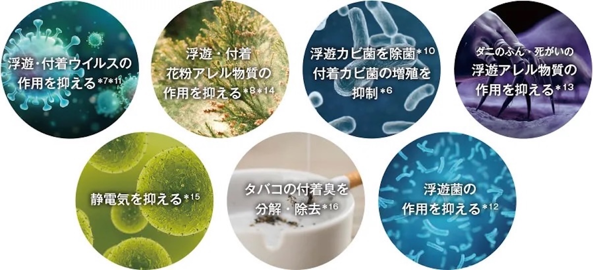 Những tác dụng chính của Plasma Cluster NEXT độc quyền của SHARPNó có hiệu quả sau khoảng 1,4 phút đến 3 ngày. Đây là kết quả trình diễn trong một không gian thử nghiệm kín tương đương với khoảng 5 đến 10 tấm chiếu tatami, không phải là kết quả trình diễn trong một không gian sử dụng thực tế. Hiệu quả thay đổi tùy thuộc vào tình huống của nơi sử dụng, cách sử dụng và từng cá nhân. Hiệu quả khử mùi thay đổi tùy thuộc vào loại mùi, độ mạnh và chất liệu của vật thể. |