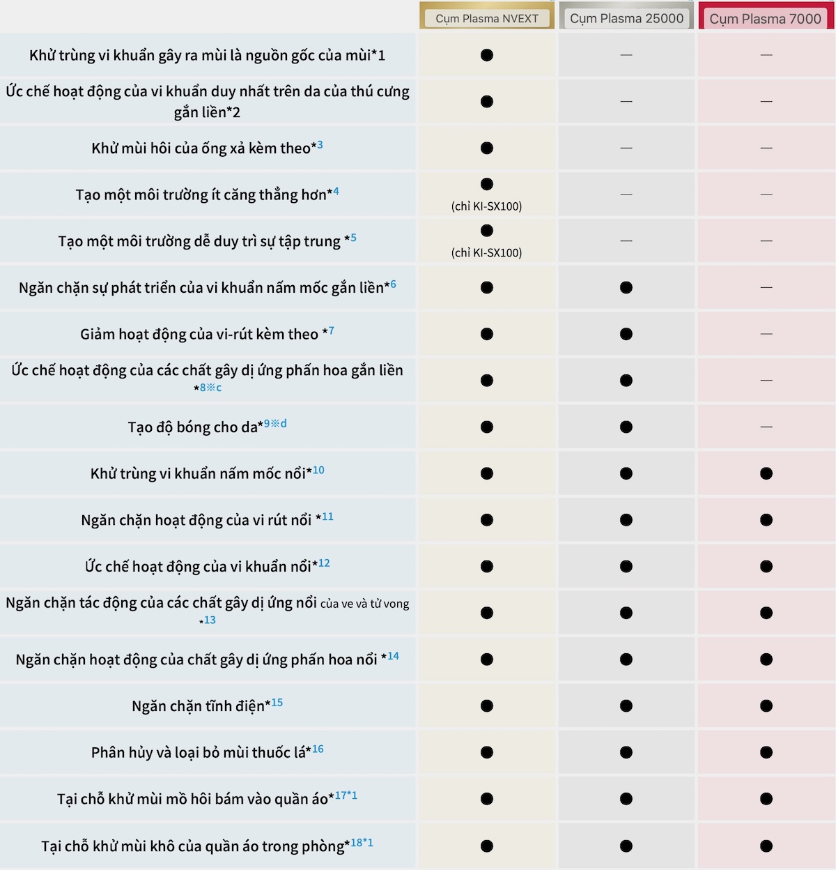 Sự khác biệt về hiệu ứng tùy thuộc vào mật độ ION. Cho thấy tác dụng vươt trội của Plasma Cluster NEXT độc quyền của SHARP, đặc biệt nhiều tác dụng chỉ có trên máy SHARP KI-SX100-WNó có hiệu quả sau khoảng 1,4 phút đến khoảng 20 ngày. Đây là kết quả trình diễn trong một không gian thử nghiệm kín tương đương với khoảng 5 đến 20 tấm chiếu tatami, không phải trong không gian sử dụng thực tế. Hiệu quả thay đổi tùy thuộc vào tình huống của nơi sử dụng, cách sử dụng và từng cá nhân. Hiệu quả khử mùi thay đổi tùy thuộc vào loại mùi, độ mạnh và chất liệu của vật thể. |