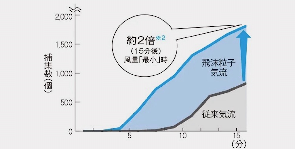 Được trang bị "chế độ hạt thả" xác nhận hiệu quả của việc thu giữ "các hạt giọt virus*1"Mô phỏng đã xác nhận rằng nó có thể được thu giữ hiệu quả bởi "luồng không khí hạt giọt" nhắm trực tiếp vào bề mặt trần nơi các hạt giọt virus dễ dàng đứng hấp thụ bụi trên luồng không khí lưu thông. |