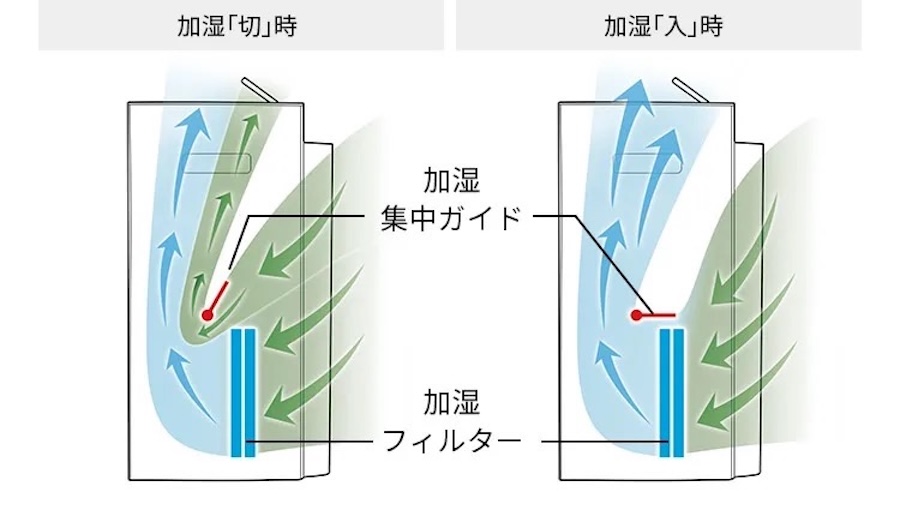 - Khi nước được làm bay hơi bằng bộ lọc tạo độ ẩm, nhiệt của không khí hít vào bị lấy đi, do đó nhiệt độ của gió thổi thấp hơn nhiệt độ phòng.