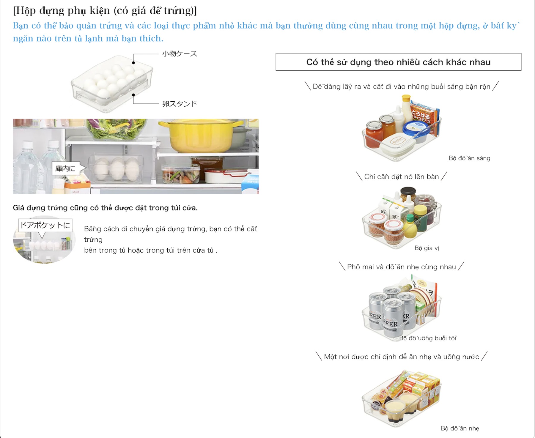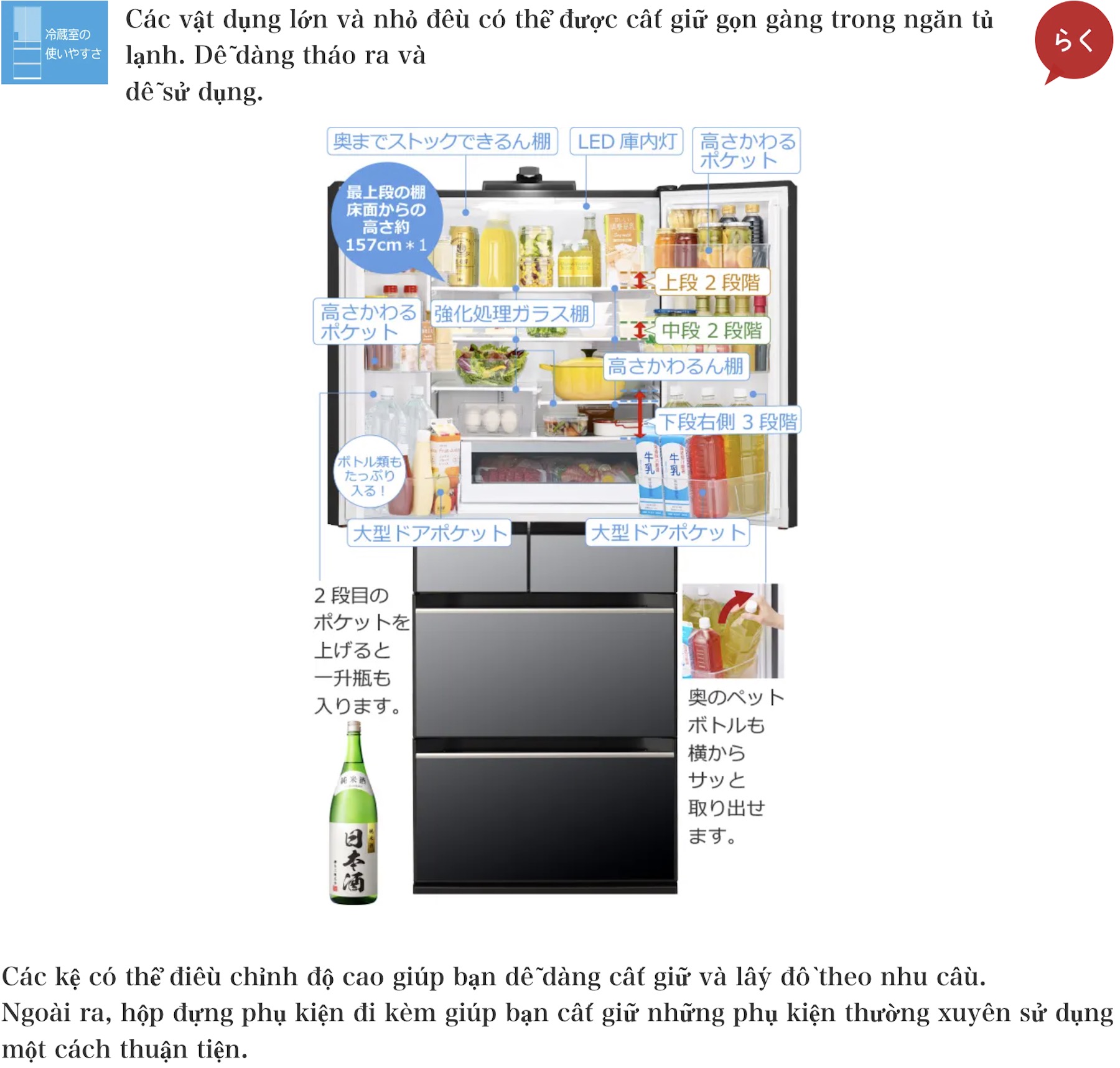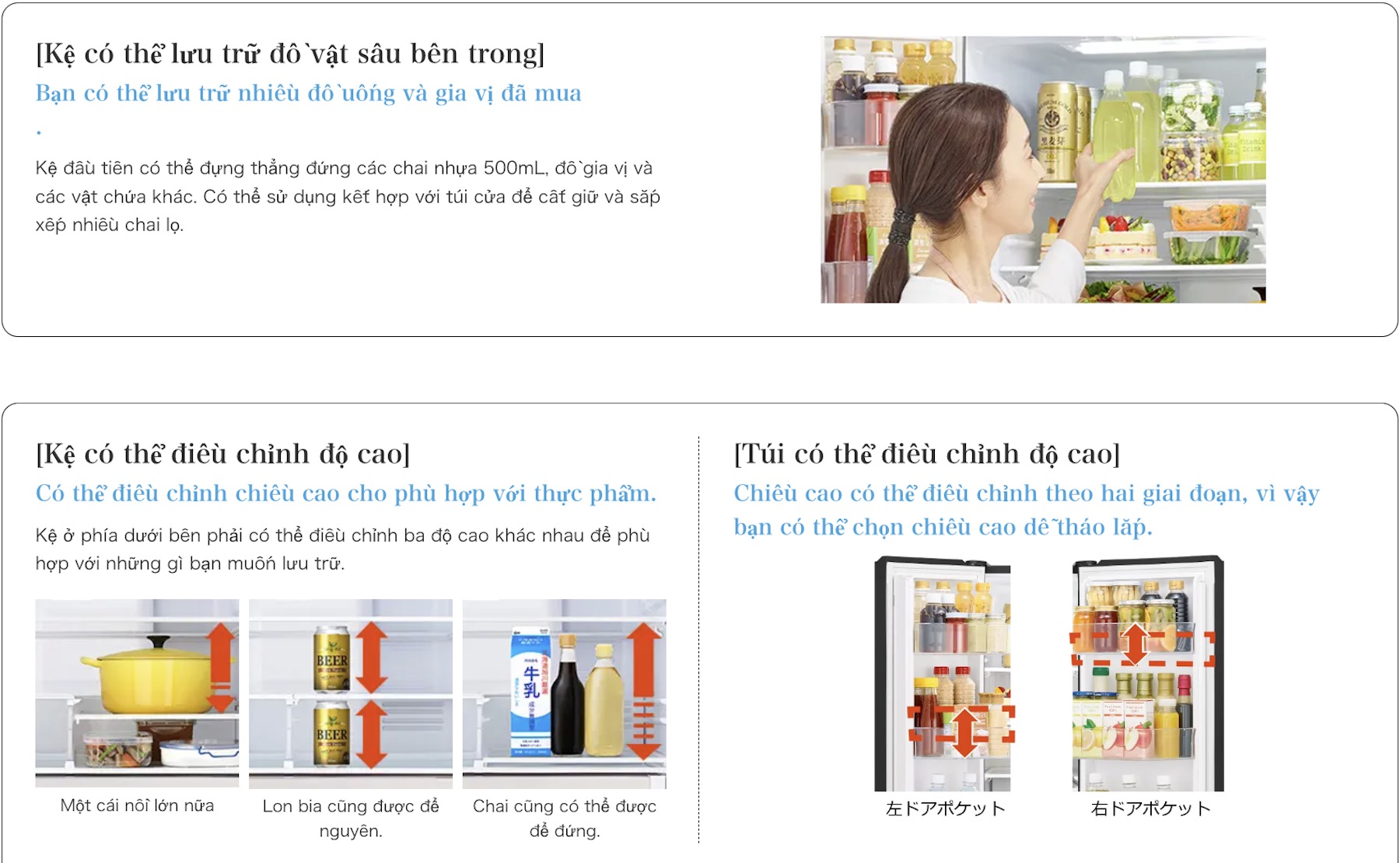 | Kệ điều chỉnh chiều cao | Có – linh hoạt trong ngăn mát và cánh cửa |