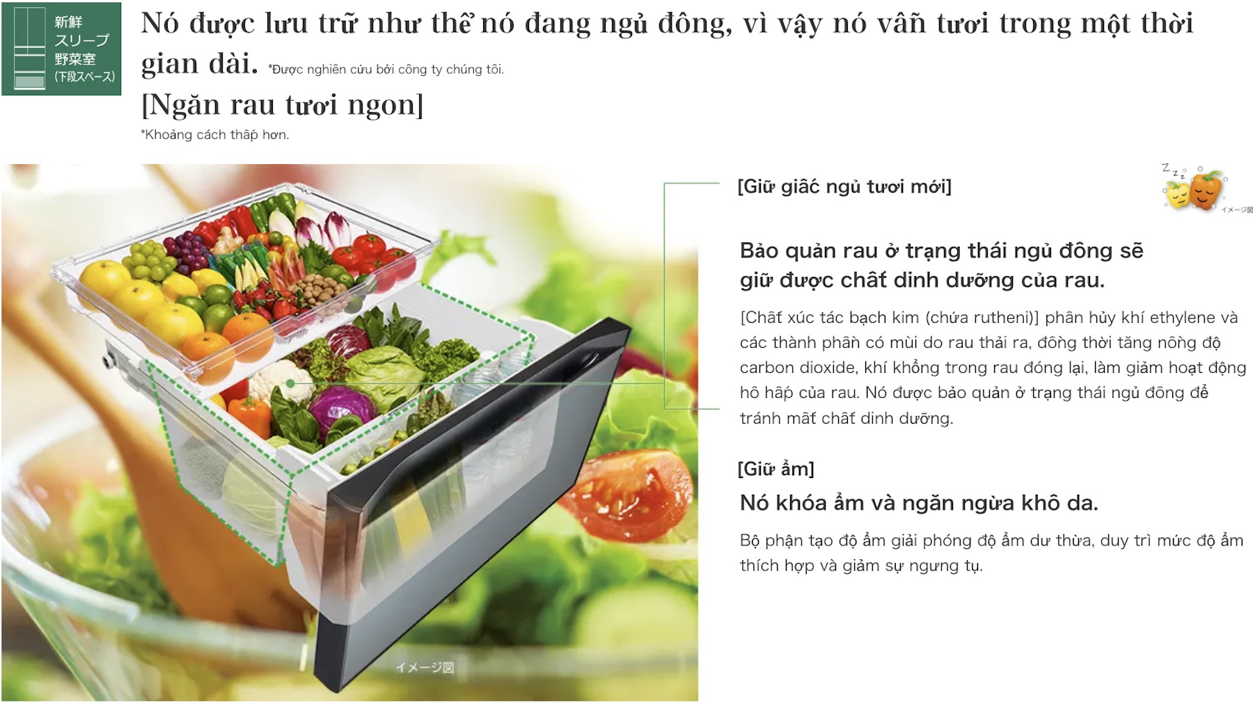 | Công nghệ ngăn rau | Shinsen Sleep (新鮮スリープ野菜室) – xúc tác bạch kim Ruthenium |