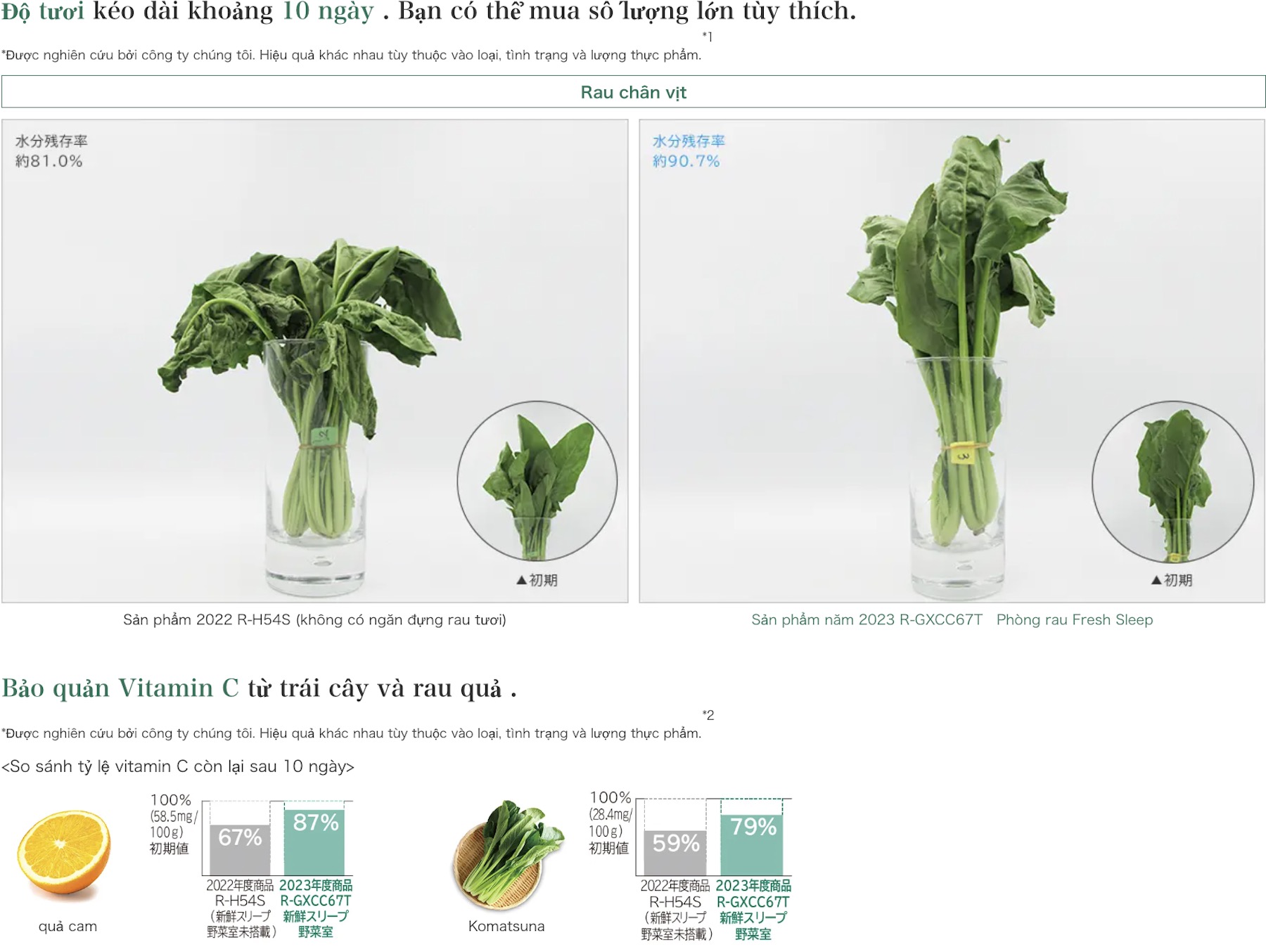 Theo dữ liệu từ Hitachi Nhật Bản, rau lá xanh như rau bó xôi bảo quản trong ngăn này duy trì tỷ lệ giữ nước đến 89%sau 10 ngày, so với khoảng 77% ở các tủ lạnh không có công nghệ tương đương. Rau không héo, không vàng lá, màu sắc và hàm lượng vitamin vẫn được bảo toàn gần như nguyên vẹn.
