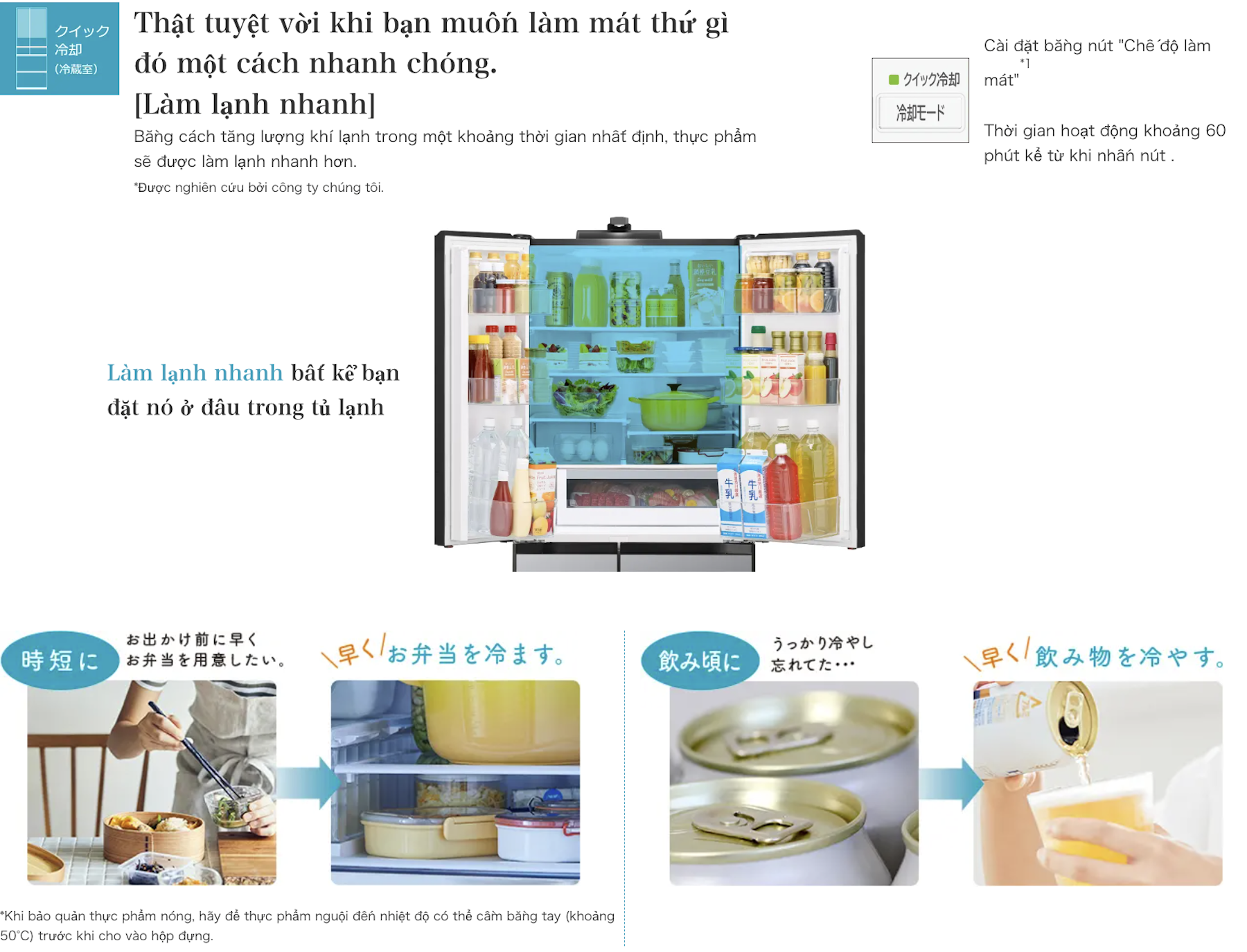 - Nhiệt độ ngăn mát thấp thoảng 2°C, giữ tươi thực phẩm lâu hơn; bổ sung vùng làm lạnh NHANH để có thể cho cả thức ăn còn nóng vào tủ mà không ảnh hưởng tới các thực phẩm khác (lưu ý vùng được phép làm việc này); việc làm lạnh NHANH được thực hiện tự động thông qua hệ thống cảm biến hiện đại.
