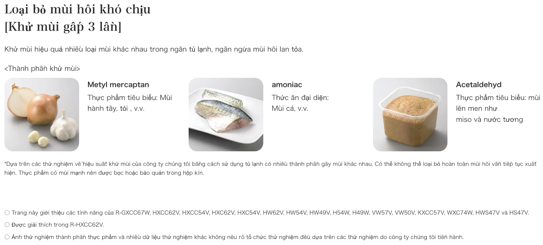 - Trang bị khả năng khử mùi (ức chế mùi) với 3 loại mùi gây khó chịu: chất Methylmercaptane (mùi hành tỏi), amoniac (mùi cá); Acetaldehyde (mùi lên men như Miso, nước tương…)