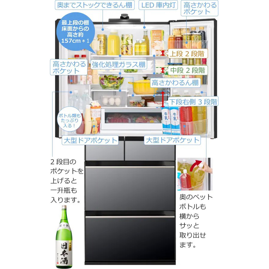Đây là công nghệ cốt lõi tạo nên danh tiếng của dòng HXCC. Marugoto Chilled (まるごとチルド – bảo quản lạnh toàn diện) duy trì nhiệt độ đồng đều khoảng 2°C trên toàn bộ không gian ngăn mát 317 lít – bao gồm cả các tầng kệ và ô đựng bên hông cửa (ngoại trừ khay cửa ngoài cùng).