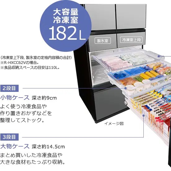Ngăn đông 125 lít của R-HXCC62V được chia thành 3 tầng với chức năng khác biệt, phản ánh triết lý bảo quản thực phẩm tinh tế của Hitachi Nhật Bản: